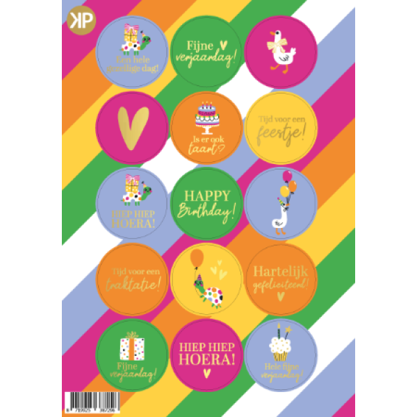Dit stickervel met een feestthema zit boordevol kleurrijke en vrolijke ontwerpen die elke gelegenheid omtoveren tot een echte party. De luxe afwerking met goudfolie geeft het een extra glamour touch, waardoor jouw uitnodigingen, cadeauverpakkingen of feestversieringen er nóg stralender uitzien.