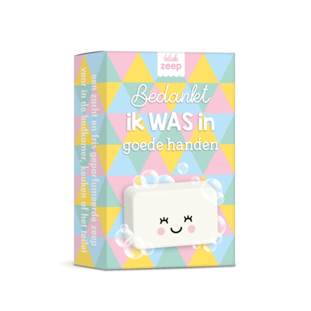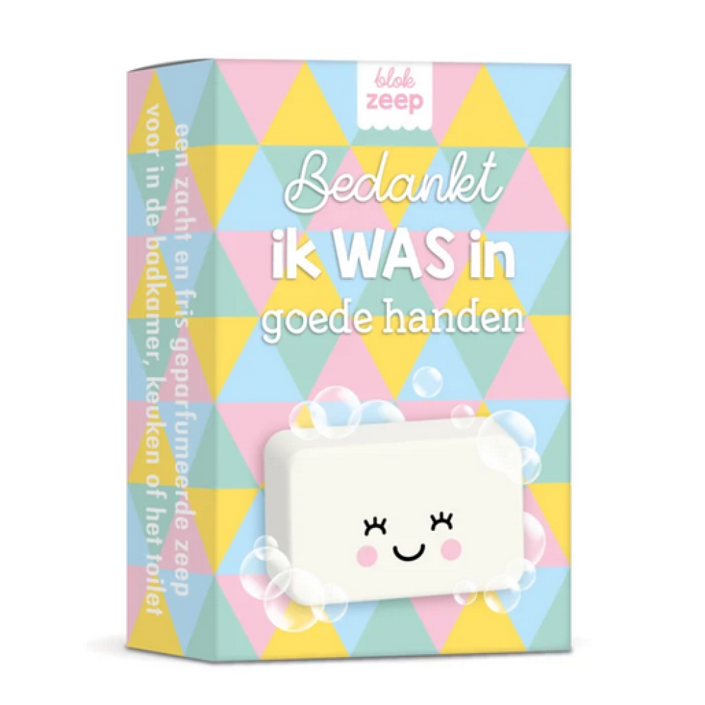 'Bedankt, ik was in goede handen' is een woordgrapje tussen wassen en handen: dus deze zeep is perfect om je handen mee wassen! Daarnaast hebben we deze verpakking speciaal ontworpen om te geven als er afscheid wordt genomen. Neemt je kind afscheid van de peuterspeelzaal? Of van het kinderdagverblijf? Of wil je de meester of juf van je kids bedanken voor het afgelopen schooljaar? Of wil je je stagebegeleider bedanken voor alles? Geef dan dit leuke zeepje en vergeet niet een lief afscheidstekstje achterop te schrijven!