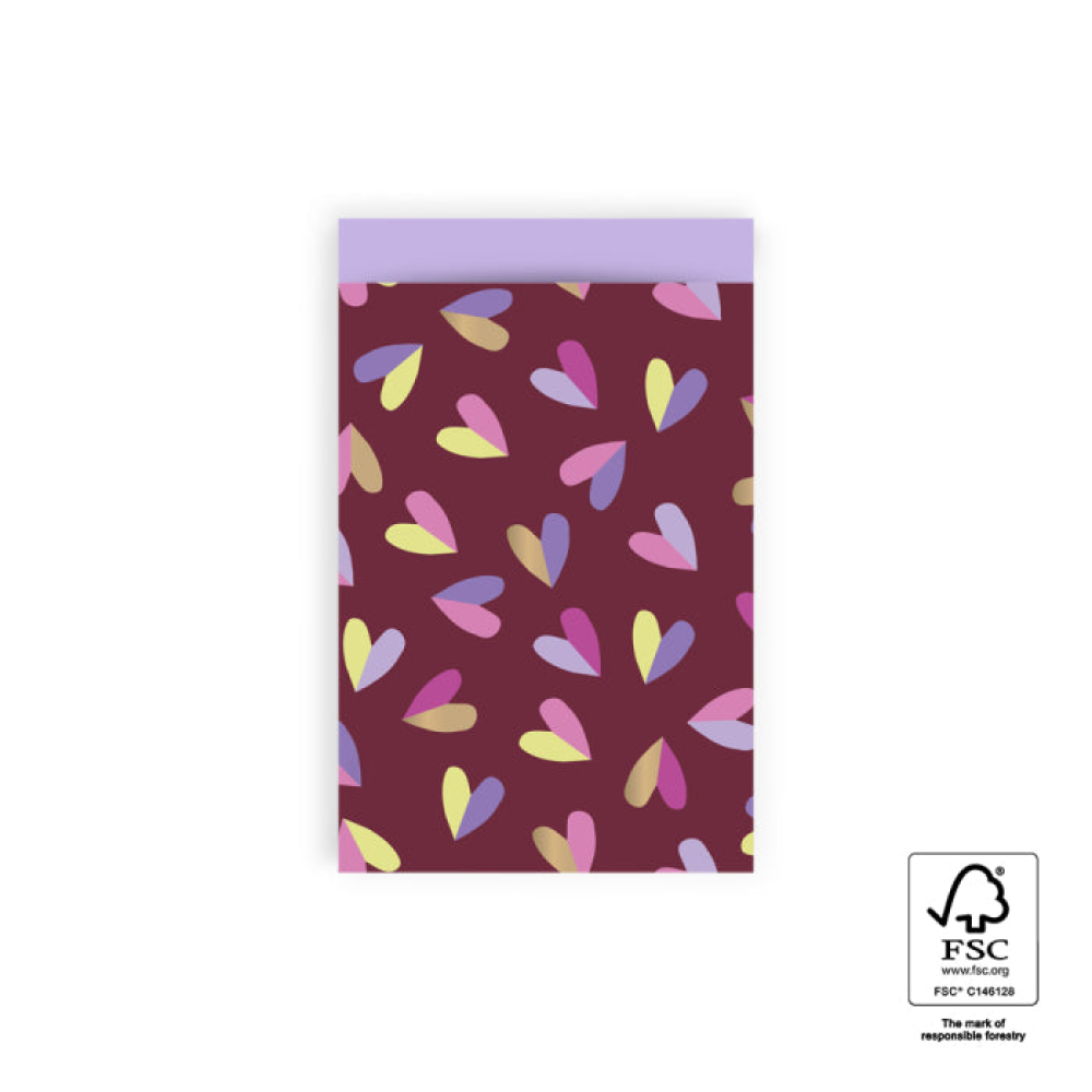 Ontdek de prachtige cadeauzakjes versierd met diverse hartjes in duo kleuren roze, paars, geel en goud op een biet rode ondergrond.