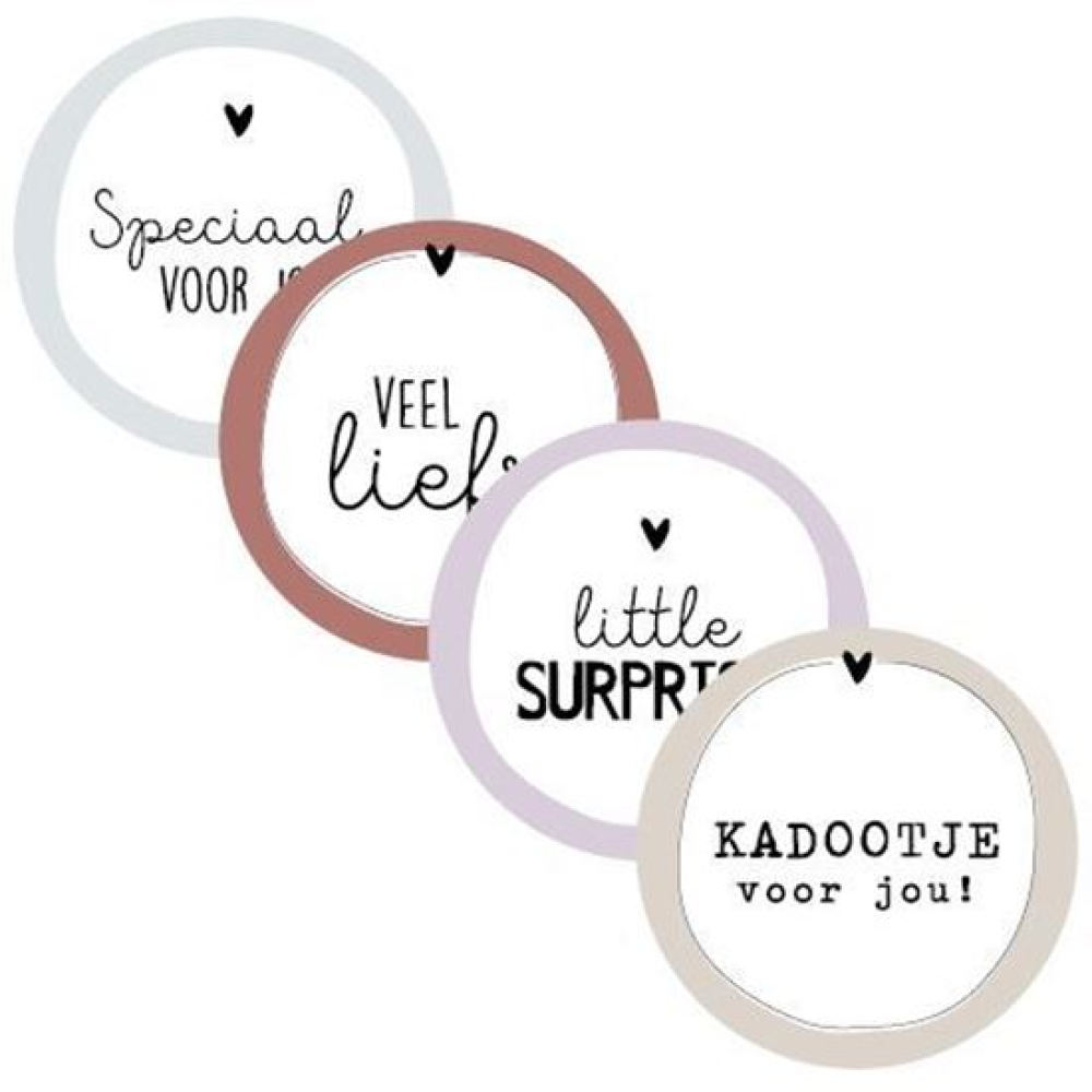 Leuk om te gebruiken als sticker op een kadootje of als sluitsticker op een enveloppe. Je ontvangt er 2 van elke soort!